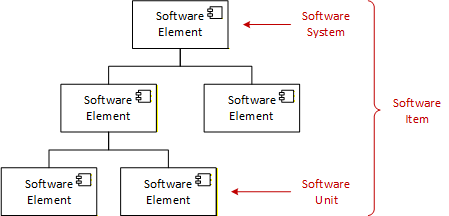 All software elements are referred to as “software item”. The top-most software item is called “software system” and the lower-most software item is called “software unit”. This is important to understand as IEC 62304 defines requirements based on these terms. For example, if a requirement is on the “software item”, then that requirement applies to all software elements.