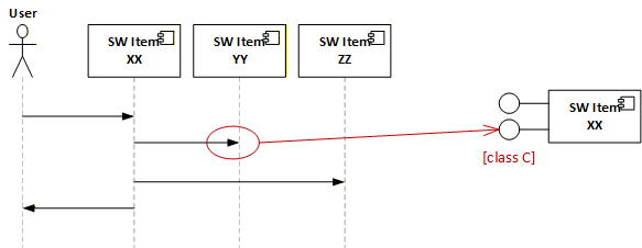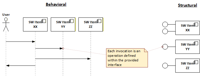 Example here uses sequence diagram showing the behavioral relationship and a component diagram showing the interfaces provided by each SW Item.